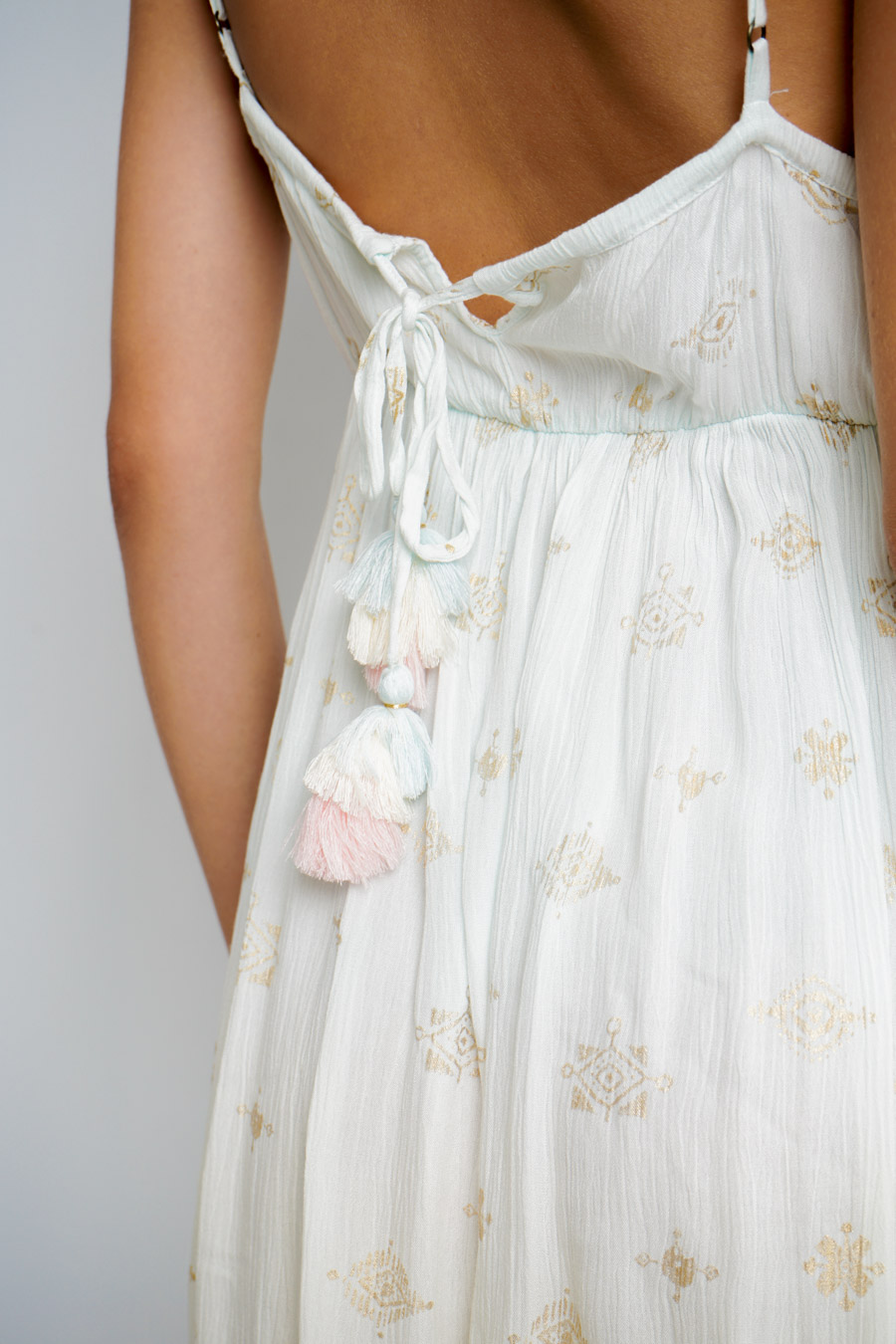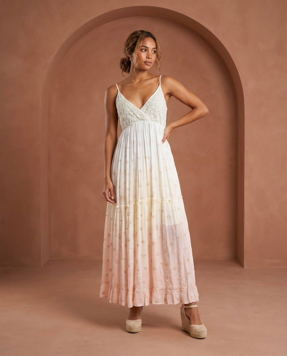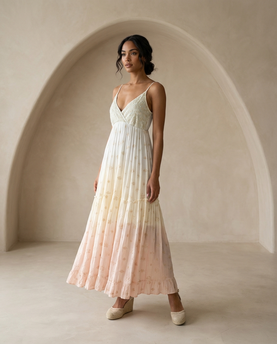 ¿Buscas el look perfecto para tus tardes de verano? 🌅 Este precioso vestido boho color en degradado es justo lo que necesitas. Con su diseño de tirantes finos y cierre de borlas en blanco, aporta ese toque bohemio que tanto nos encanta. El degradado suave le da un aire romántico y único ✨ Confeccionado en algodón 100%, es súper fresquito y cómodo para esos días de calor. Talla única que se adapta fácilmente. ¡Ponte guapa sin esfuerzo!